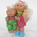 Big Sister, Little Sister set of Cabbage Patch Kids - Kid & Toddler - Blonde hair and blue eyes, pink and green outfits.