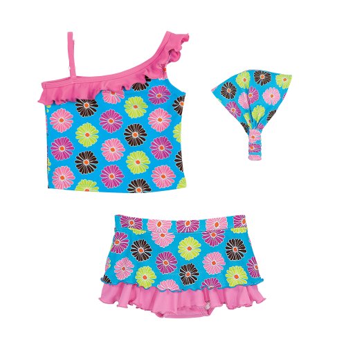 This Sun Smarties outfit includes 1 tankini top, 1 swim diaper skirt, and 1 headband.
